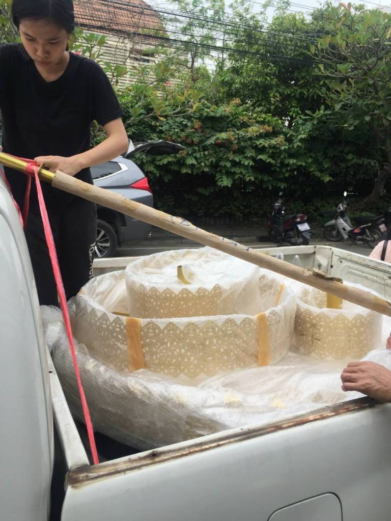 ก่อนจัดส่ง ทางร้านจะถอดฉัตร ออกเป็นชั้นๆ แพ็คห่อแต่ละชั้น ด้วยกันกระแทกอย่างดี ไม่มีค่าใช้จ่าย